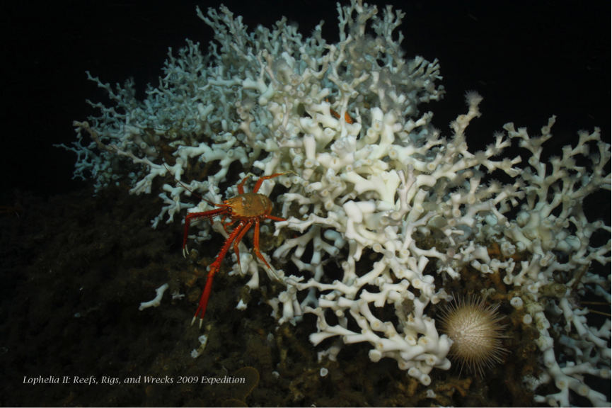 Georgia’s continental shelf includes the Blake Plateau and is home to Lophelia pertusa, a filigreed deep-water coral that lives without the symbiotic zooanthellae algae that shallower corals invite into residence for protection. Extremely slow growing, it is the favored home of many species, including sharks, groupers, conger eels and more, which feed on the colonies of hatchetfish and lanternfish swimming above. Other lifeforms cohabitate on or among the Lophelia pertusa, like squat lobsters, brittle stars, crabs and various molluscs.  While these corals are not in a threatened status, this may change in the future as deep ocean trawling fisheries destroy large swaths of life on the bottom.